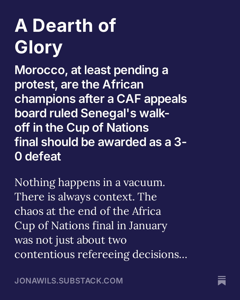 Nothing happens in a vacuum. There is always context. The chaos at the end of the Africa Cup of Nations final in January was not just about two contentious refereeing decisions that went against Senegal in quick succession, and neither will the response to CAF’s decision to award the trophy to Morocco be just about Senegal’s reprehensible walk-off.