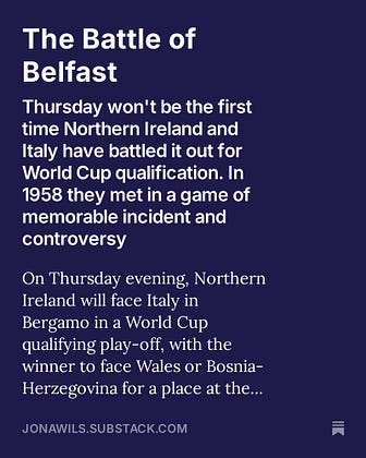 As Northern Ireland prepare to face Italy in a World Cup qualifying play-off in Bergamo, Wilson’s World looks back at their tumultuous meetings in Belfast in 1957-58.