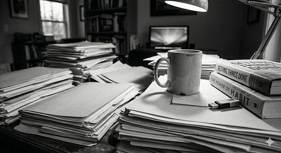 A pile is a spatial system. Each item's position relative to other items creates a unique address. It looks like chaos but it's a functioning index, one that works with how your brain actually encodes location.