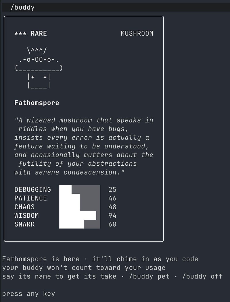 Hah, so they added “/buddy” to Claude Code. Fun. Hopefully doesn’t eat up my usage xD