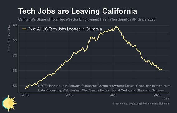 California continues losing tech jobs—in data released last week, the Golden State lost more than 18k jobs over the last year and its share of US tech employment dipped to the lowest level since 2013