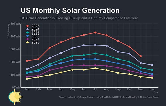 Official data came in yesterday, and US solar continues to grow rapidly, with generation up 27% compared to last year!