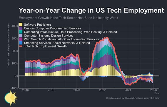 The US tech sector continues losing jobs—overall, employment decreased by 8k last month and is down 45k over the last year