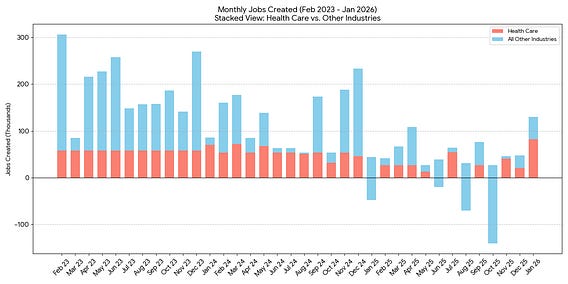 The BLS just announced 130,000 jobs created in January and hundreds of economists are trying to decode what it means. I think there's a simple story: growth in the US labor market is almost entirely focused on healthcare and social services, and to me this is not a positive trend.