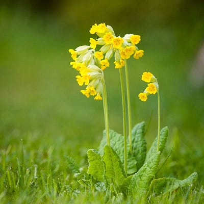 In my garden and out in the meadows, the cowslip’s tiny stems are rising sturdily and proudly out of the winter mud. Spring is here when the cowslips come.
