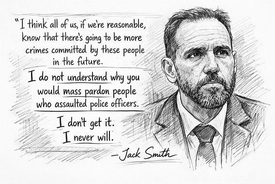 "I think all of us, if we're reasonable, know that there's going to be more crimes committed by these people in the future. I do not understand why you would mass pardon people who assaulted police officers. I don't get it. I never will." ~ Jack Smith on Trump and his J6 insurrectionists