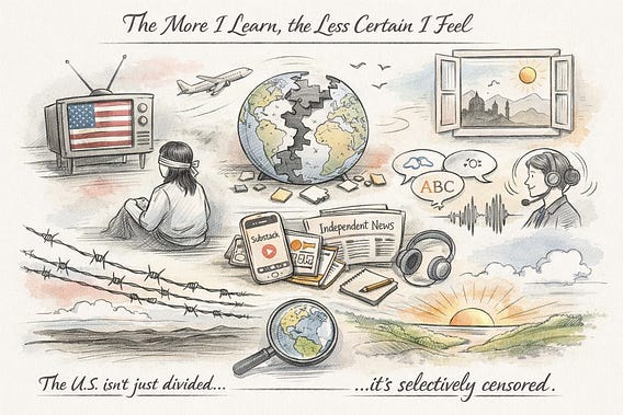 Listening to independent voices from other countries, reading Substack writers across the world and watching footage that never makes it onto U.S. television has been humbling. The more I learn about other cultures, conflicts, histories and perspectives, the less confident I feel about the tidy version of the world I grew up with.