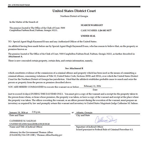 In my judgment, the Fulton County search warrant & it’s implications for the 2026 & future elections is the most important news out there right now & not getting the coverage it merits. Read my most recent piece to get the download on everything you need to know & understand why this is such a significant development.