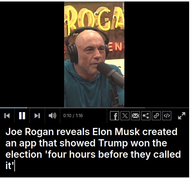 Joe Rogan - said Elon knew the election results 4 hours before anyone else because of an App and algorithms.