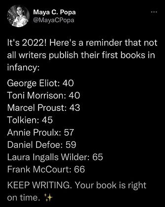 Keep writing. You’re not a “late bloomer.” Maybe you’re just on time.