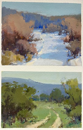Here are my two latest gouache paintings together on one sheet for a better comparison.