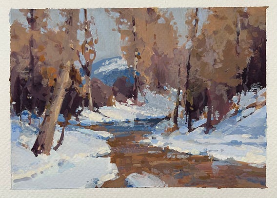 I painted this Scott Christensen master study in gouache, focusing on his color decisions. There’s something subtle in how he shifts temperature and value that feels simple at first, but becomes much more complex when you try to replicate it. I found myself slowing down, questioning each mix, and realizing how intentional every color choice really is.