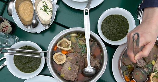 Tafelspitz, Schulterscherzel, Hüferscherzel (Hüfte oder Sirloin Steak) – und Tobias Mueller nennt das respektlos «gekochtes Rindfleisch»? 😄 🥩 Mein Wiener Herz leidet an Schmerz! Aber Tobias macht in seinem neuen Newsletter genau daraus eine Mission: die Suche nach dem perfekten Siedfleisch. 🕵️♂️ 🍲