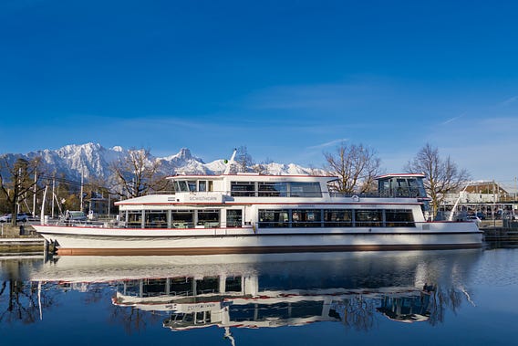 Up front, you’ve got the motor vessel MS Schilthorn (about 140 feet long, room for 300 folks) sittin’ in the harbor of the small town of Thun (Switzerland). And in the back, the Stockhorn range rises up, with the Stockhorn peak (7,185 feet) right there in the middle like it owns the view.