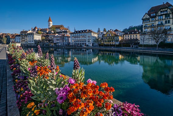 Early Easter Sunday mornin’ in the Swiss town of Thun: down by the Aare River, orange wallflowers are showin’ off, pink ranunculus are actin’ fancy, and purple violets are keepin’ company with those dark, regal crown imperials.