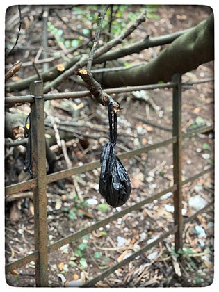 I carried my bag of problems, squishy and smelly, hard packed and brown and passed a branch and hung it on, and walked on, a spring in my step, light in my soul, a smile on my lips, my cares left behind for someone else to find and add their own.