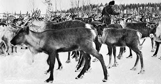 The Sámi languages have many words for snow, but their vocabulary to describe reindeer is even more intricate. In North Sámi a reandi is a male reindeer with long antlers, ruvggáladat is a reindeer that has run away from the herd, and čearpmat-eadni is “a female reindeer that has lost its calf of the same year but is accompanied by the previous year’s calf.”