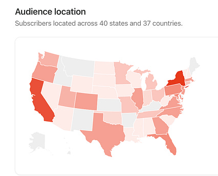 And I can’t think of anything more joyful than focusing on the silliest of substack stats and welcoming folks from Delaware, Maine, Kentucky, Arkansas, Kansas, New Mexico, Idaho, Montana, Alaska, and Hawaii into this space.