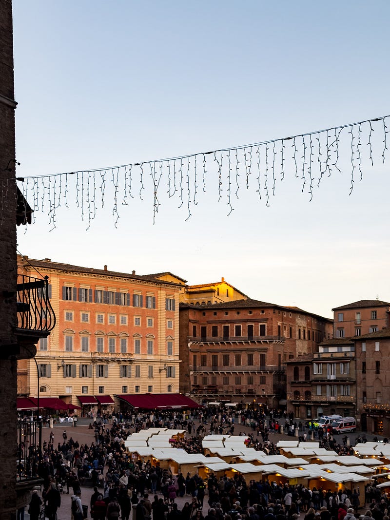 Siena in a beautiful afternoon light and its Christmas market in Piazza del Campo.