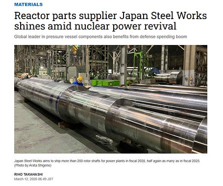 JSW (5631) is the figurehead. Large cap, strong moat, exposure to both nuclear construction and defense rearmament. The Nikkei ran a piece today echoing what we flagged weeks ago. If the Muroran plant stopped, global nuclear construction would stop. Margins have expanded from 7.7% to 18.5% in FY2024, defense sales set to quadruple as Japan's sole artillery manufacturer, and the stock has underperformed Tier 1 defense names for seven months. The longer-term setup remains compelling.