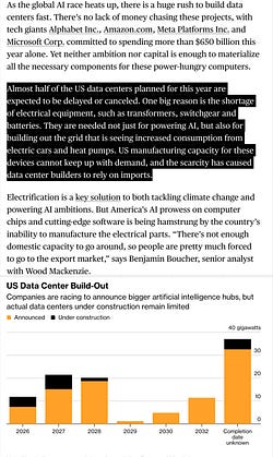”Half of US data centers planned for 2026 are expected to be delayed or canceled. One big reason is shortage of electrical equipment, such as transformers, switchgear and batteries…”