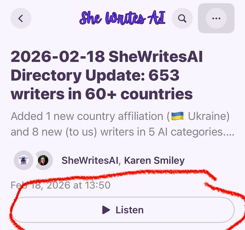 Here’s a happy surprise for folks who prefer listening to reading: this SheWritesAI article has read-aloud (voiceover).