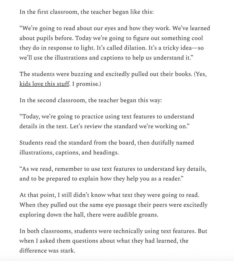 I love a good show-and-tell, and Kristen McQuillan really crystallizes the difference between text-centered instruction and standards-centered instruction (I might describe it as skill-centered instruction) here.