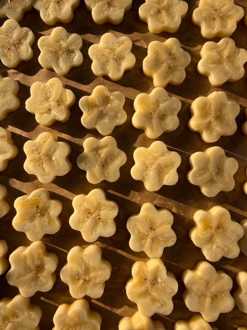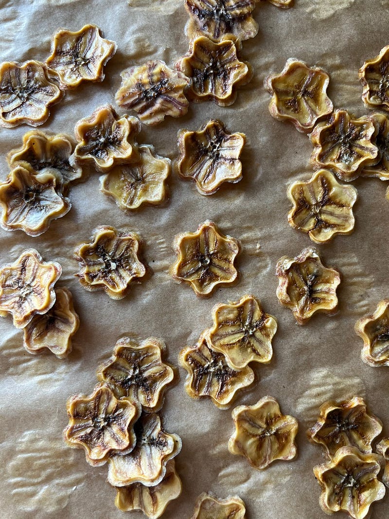 i slice them about ¼ inch thick, use a small cookie cutter (flower, star, etc.) to cut out my shapes, and place them on parchment paper. bake at lowest temp (200 for me) in my air fryer for about 80 minutes and voila✨
