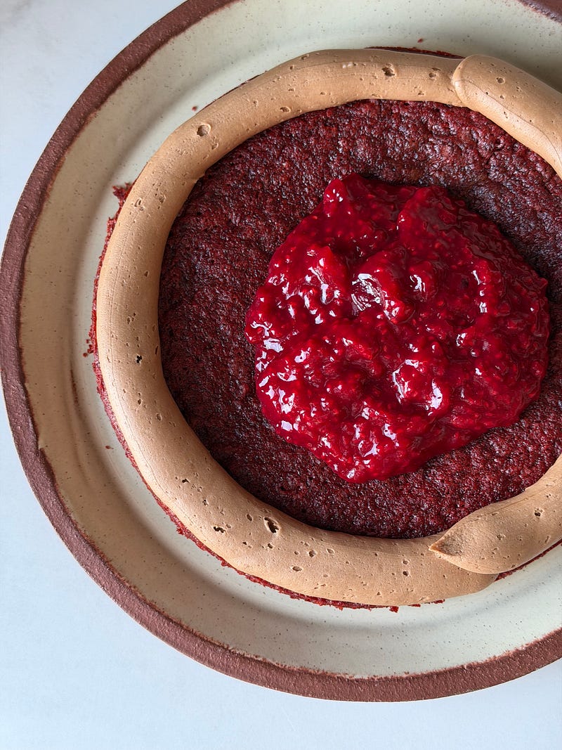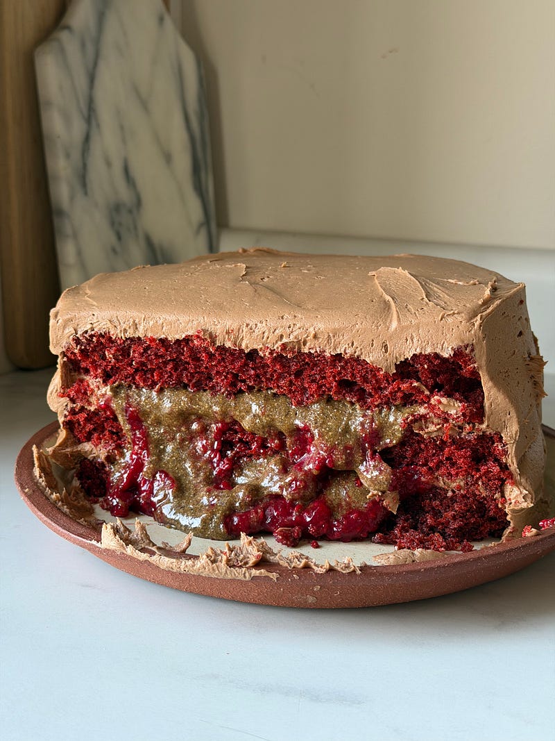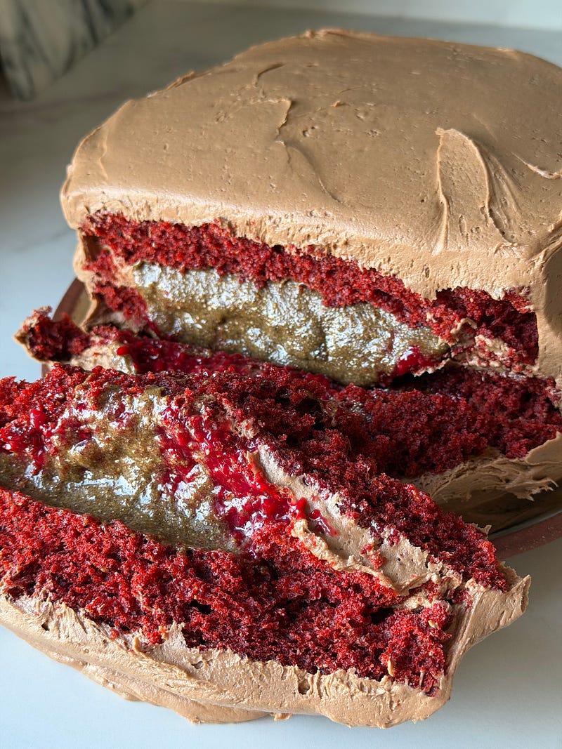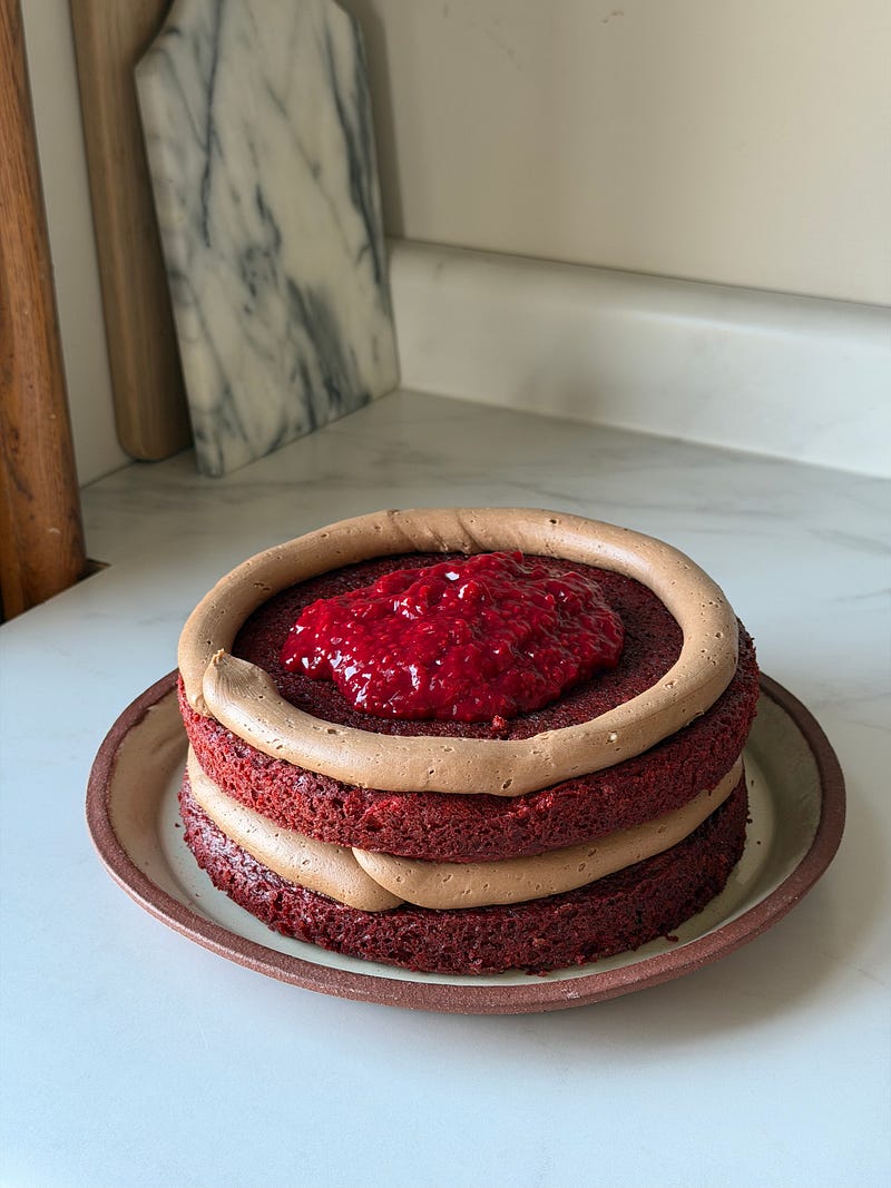 a fail but also a win - red velvet cake with hazelnut praline and raspberry compote filling + chocolate cream cheese buttercream.