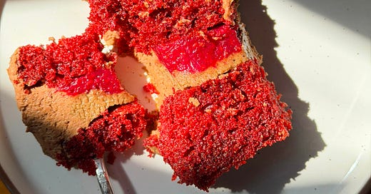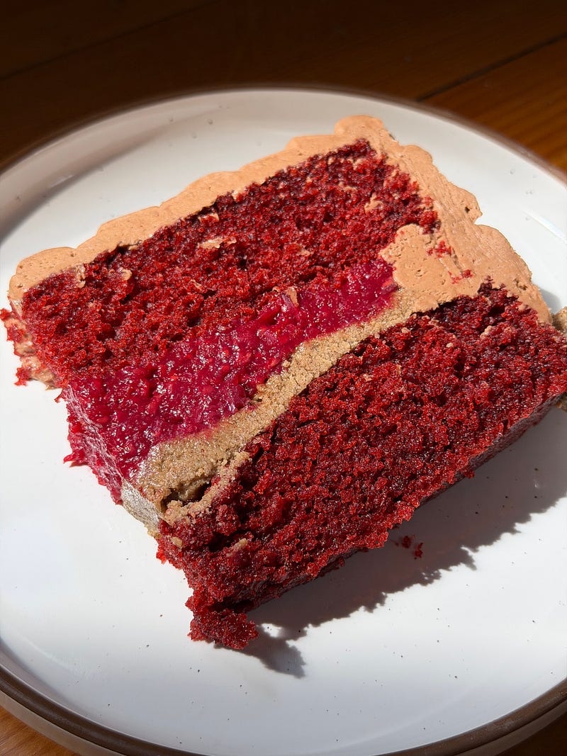 Red Velvet Cake + Raspberry Hazelnut Praline Filling + Chocolate Cream Cheese Buttercream