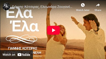 Greek lyrics in English: NEW RELEASE, SUMMER HIT: ΕΛΑ ΕΛΑ - ELLA ELLA - Γιάννης Κότσιρας, Ελεωνόρα Ζουγανέλη; Έλα Έλα. (Yannis Kotsiras, Eleonora Zouganeli: Ella, ella). Official Music Video. Μουσική/Στίχοι : Παναγιώτης Καλαντζόπουλος