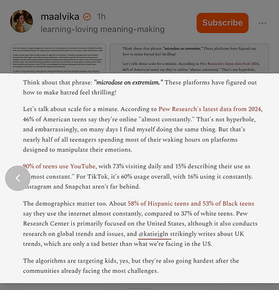 This is, supposedly, the part of the plagiarised essay that ‘proves’ I was both mentioned and that it included original research I didn’t reference in my own. The problem is, the statistics cited here are from a Pew Research survey conducted between September 18 and October 10, 2024, and only published on December 12, 2024 (source linked below). The plagiarised piece, however, was published on March 13, 2024. Unless time machines exist, there's simply no way this data could have appeared in that article at the time of publication. And considering it was removed that same month, there’s also no way it could ever be included in there.