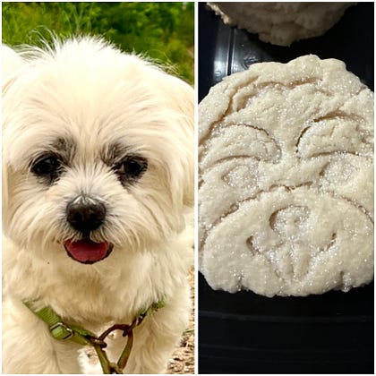 Then I discovered white sprinkles...very hard to get white sprinkles. I drove 40 minutes to find a Walmart that had them. Covered the cookies. They came out perfect. Except it was now three weeks later and a Friday. The vet’s office was closed. I gave some of the cookies to friends and the maintenance guys. Ate the rest.