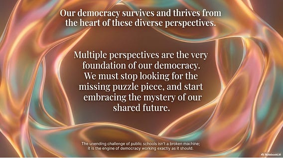 Diverse ideas, opinions, people, and places are the foundation of democracy. Public schools embrace that fact and contribute to the health and success of democracy. Stop looking for public school reform in one single place, or worse yet, in all the wrong places. The unending challenge of public schools isn’t looking for what’s broken. Public schools are the engine of democracy working exactly as it should.