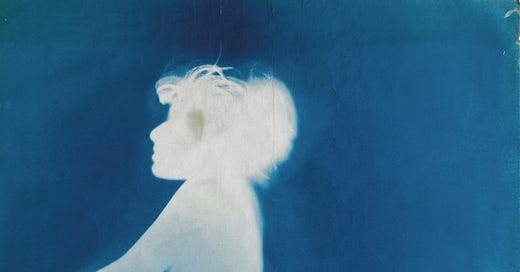 Her process stems from the 19th century 'cyanotype' technique that involves coating paper in light sensitive solutions (which turn to Prussian blue in sunlight), and arranging objects and bodies directly onto the paper (in the dark) to create these otherworldly images...