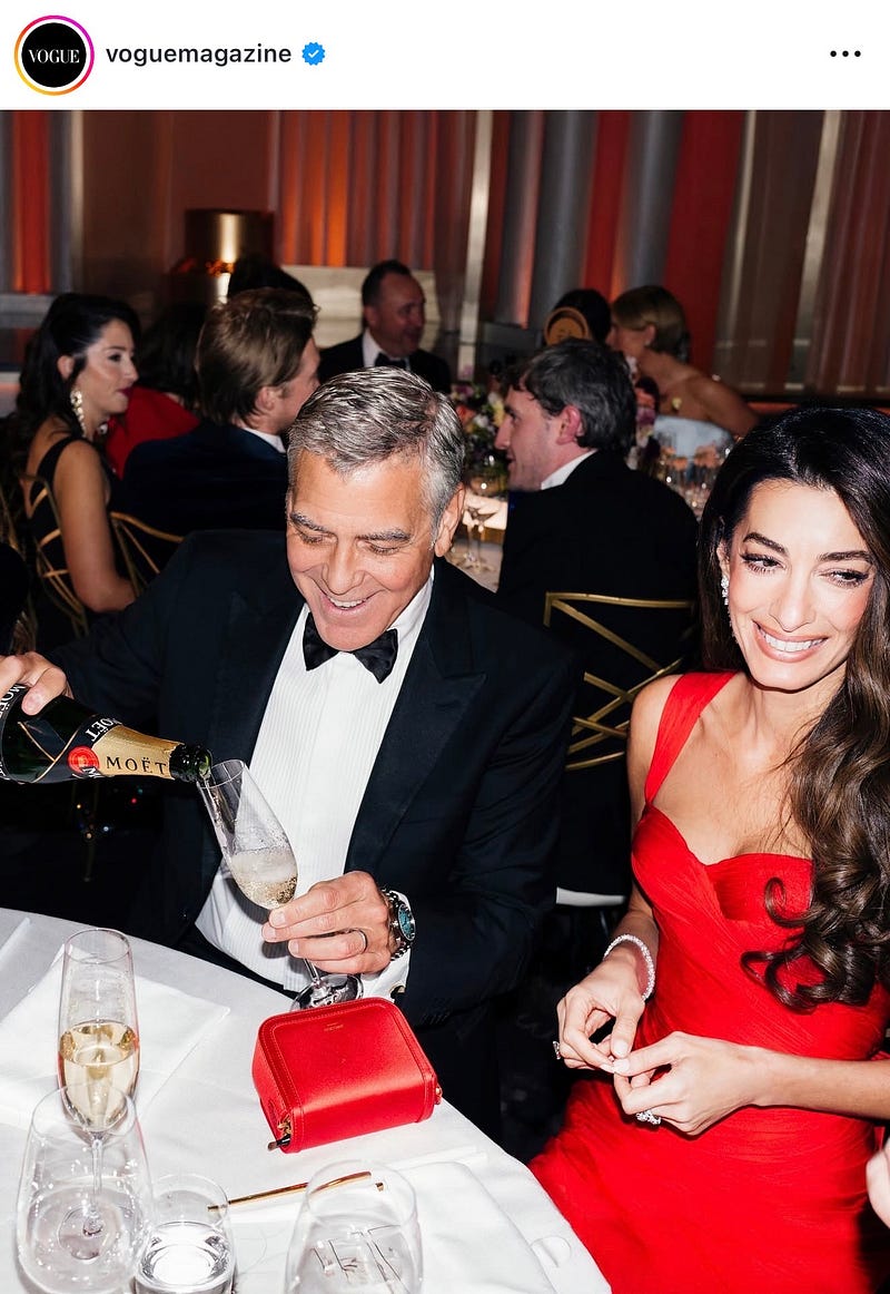 Was zooming in on Amal’s bag to see who made it (Jimmy Choo) and was so pleasantly surprised to see an eyeshadow brush sticking out. Something so unexpectedly humanizing…