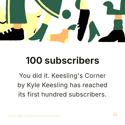 I have reached 100 subscribers! 🤯 Saying that I am immensely grateful doesn’t cut it. But, thank you to those who subscribe to Keesling’s Corner. I pray you will be edified by my writing. May we continue to look toward eternity, basking in the Light that is our Savior. And to those who haven’t subscribed, consider it or something? 😉
