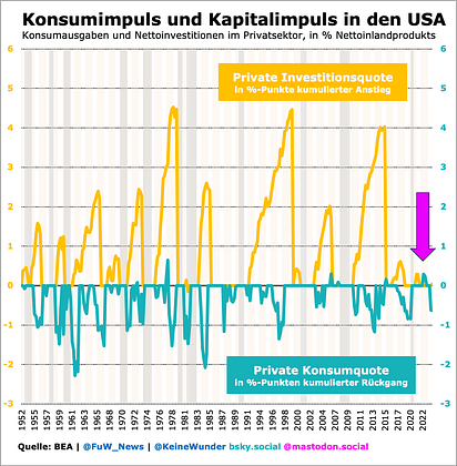 #K_Notizen. Wenn es in den USA derzeit überhaupt eine Rezesssionsgefahr gab/gibt, dann immer im Sinne einer Rückprallkrise infolge der starken Erholung wie nach tiefen Einbrüchen üblich… Zyklische Krisenbedingungen sind dagegen derzeit keine erkennbar, weil es einfach noch keinen Zyklus gab, der die grundlegenden makroöknomischen Ungleichgewichte aufbaut… Ungleichgewichte heisst in Kurzform: Die Investitionsquote rennt im Aufschwung der Konsumquote davon…