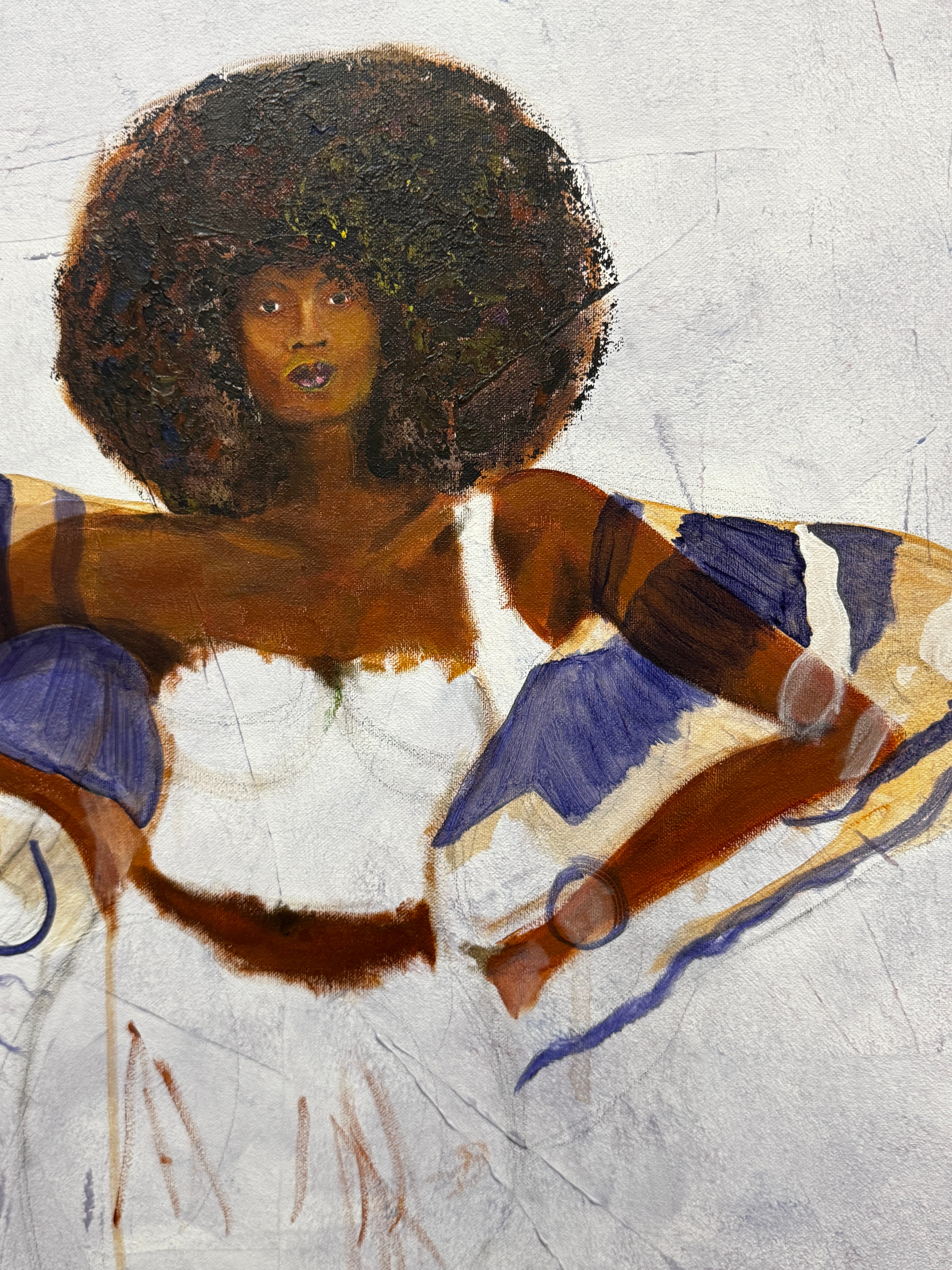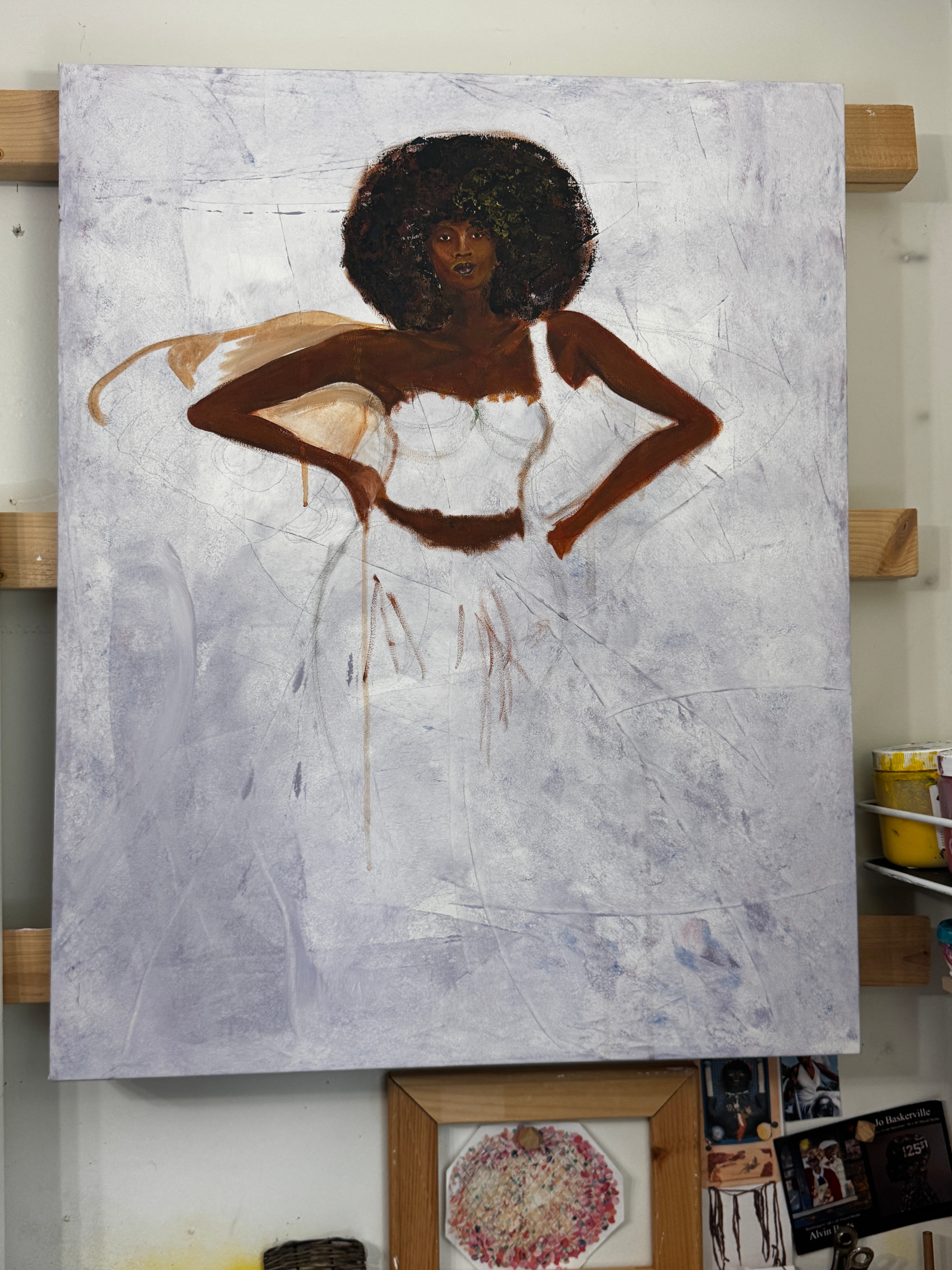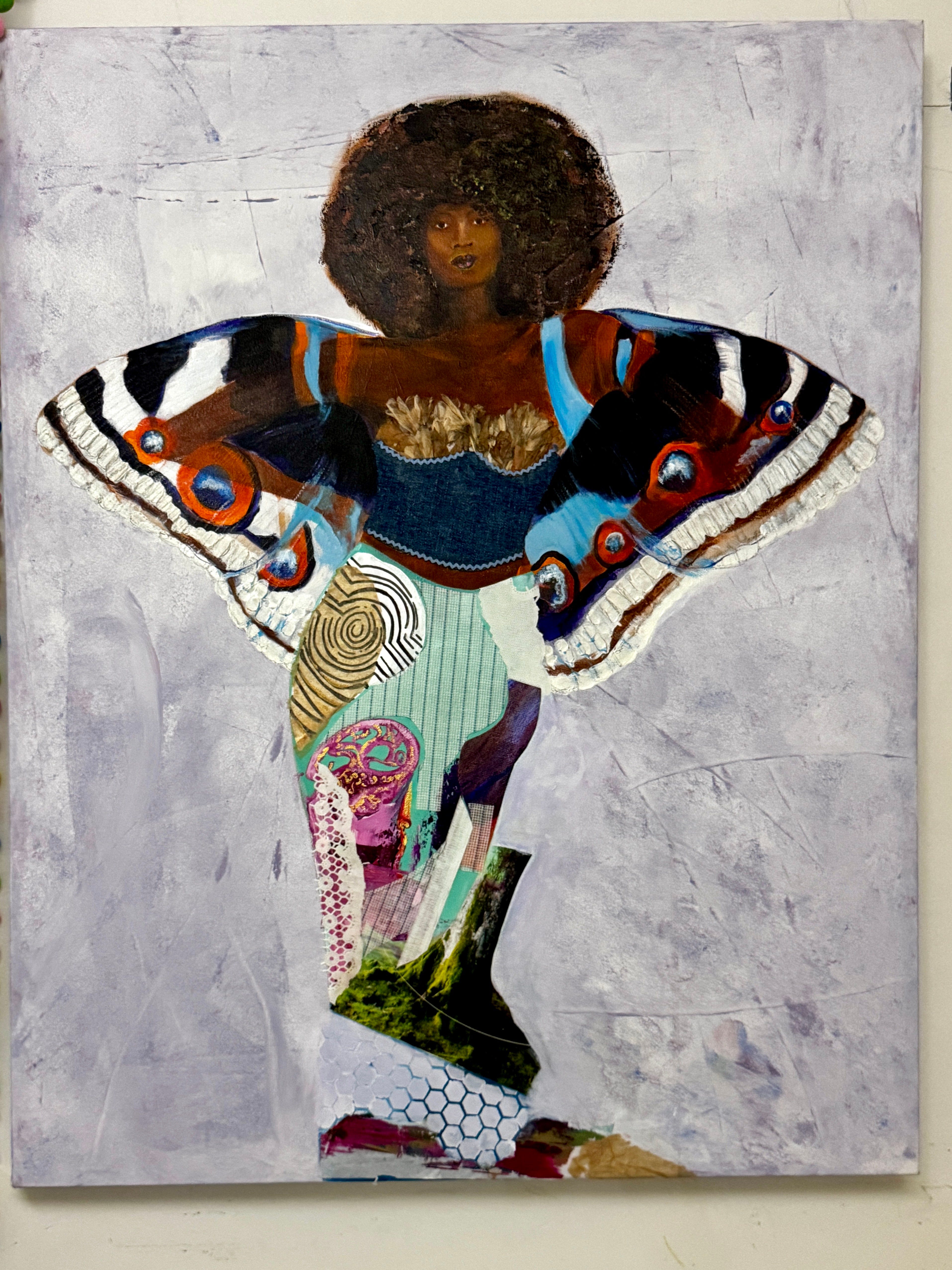 I create my collages using paper, acrylic paint, fabric, and trim, layering these materials to build texture and depth. When I work, I gather each element on my table with intention, guided by the thoughts and emotions I want to express. Sometimes I wait for the materials to “speak,” to show me what they represent. Each piece becomes a fragment of identity — fragile, strong, imperfect, and ever-evolving.