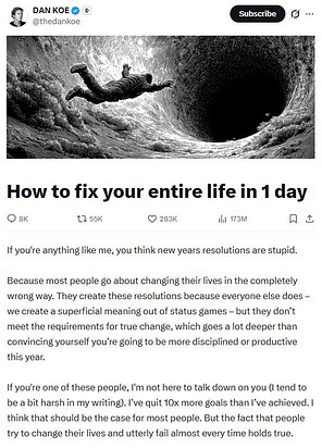Dan Koe這篇《How to fix your entire life in just one day?》在X上閱讀量已破1.73億了。