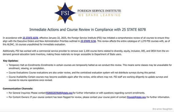 Foreign Service Institute (government office that trains U.S. diplomats) just removed 2,100 courses and suspended others in order to conduct "a comprehensive review of all courses to ensure they align with the Executive Orders" issued by President Trump, per State Department memo leaked to me.Foreign Service Institute (government office that trains U.S. diplomats) just removed 2,100 courses and suspended others in order to conduct "a comprehensive review of all courses to ensure they align with the Executive Orders" issued by President Trump, per State Department memo leaked to me.