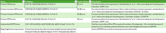 It occurred to me that some people might find a view of those exported regex libraries in Excel, which has pretty good capabilities for extracting data from XML files. And indeed, my first look at this is promising…