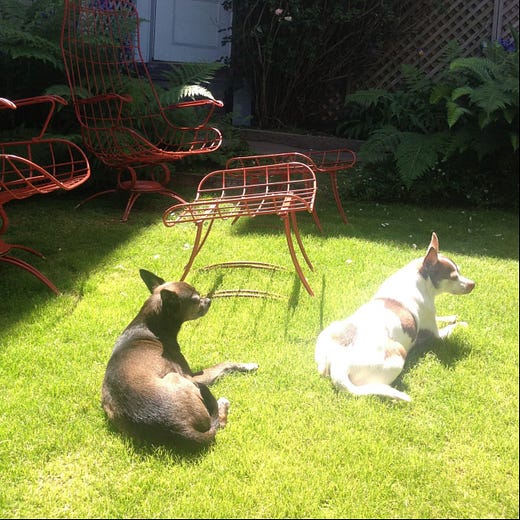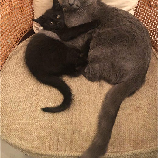 Here is my first note. I’ll be using this more and more as I try to wean myself from so much Facebook posting. To christen it and to conflate it with the recent National Pet Day, here is a photo of Archie the first day he began to live with me at my place in NYC. He died in my arms 14 years later at my place in SF. He herded me toward recovery and deeper sense of home there; one of the things I am most grateful for in my whole life is that the last five years of his life he never saw me high again. When he and later little brother Teddy both had died - that’s them in our garden atop Telegraph Hill in a kind of halcyon time in our lives - I decided to try being a cat person when I moved to Hudson, NY, where Teddy died. I began to foster Finn who was already a grown cat but I sensed he needed a little sibling too. I think it is arrogant of humans to think we are enough for our animal companions and, if we can swing it, they need another animal one as well. So one Christmas Eve I adopted Matty and this was what I woke to on Christmas morning. When I began my life as a pilgrim after selling or donating almost everything I owned, I had to find Finn and Matty a new home - I refused to separate them - and they are now living with a remarkable loving man named John in upstage New York. I write this sitting in a cafe in Paris looking at these photos and realizing that loving our animal companions often teaches us about loss either with their own shorter lives or when our own lives change and we have to break our own hearts by finding them a loving home and realizing we were serving as a conduit to save their lives from a shelter, find them a new human companion, and lovingly move on. Herding us toward our deeper, truer home sometimes becomes herding them toward theirs. So here is to Archie and Teddy and Finn and Matty. And the home they all taught me to carry within myself where is some way they all still live. I wanted to make note of that. Onward.