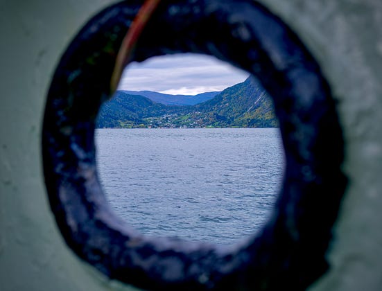 View of Solvorn from a porthole in a tiny, old ferry from Ornes (Luster, Norway)