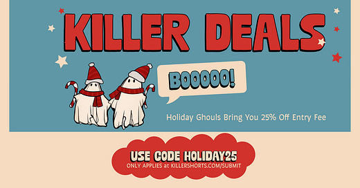 Anyone can use this discount code! Happy Holidays! (Send us your scripts and stories, horror writers!)