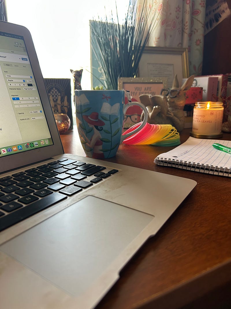 45 minutes on my novel. More writing than staring out the window today. Didn’t pick up the slinky once! Juggled chapters around. Cut stuff, added stuff. It’s good enough for now.