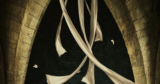 Surreal archway artwork featuring a seated figure in white beneath hanging ribbon-like forms in a dark stone passage. Atmospheric light, ritual stillness, and dreamlike symbolism create a contemplative visual pause.