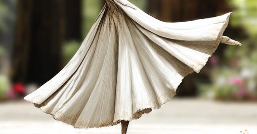 A whimsical fantasy image of a wood-like dancer spinning in a flowing white skirt before towering redwood trees.