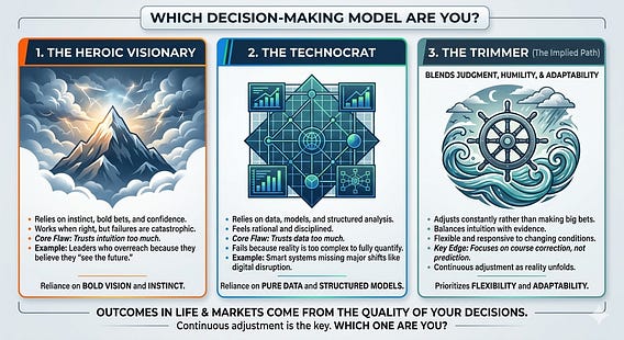 Implied third approach (“the trimmer”): Adjusts constantly rather than making big bets. Balances intuition with evidence. Stays flexible and responsive to changing conditions. Focuses on course correction, not prediction. The edge comes from adaptability. Not predicting perfectly, but continuously adjusting as reality unfolds.