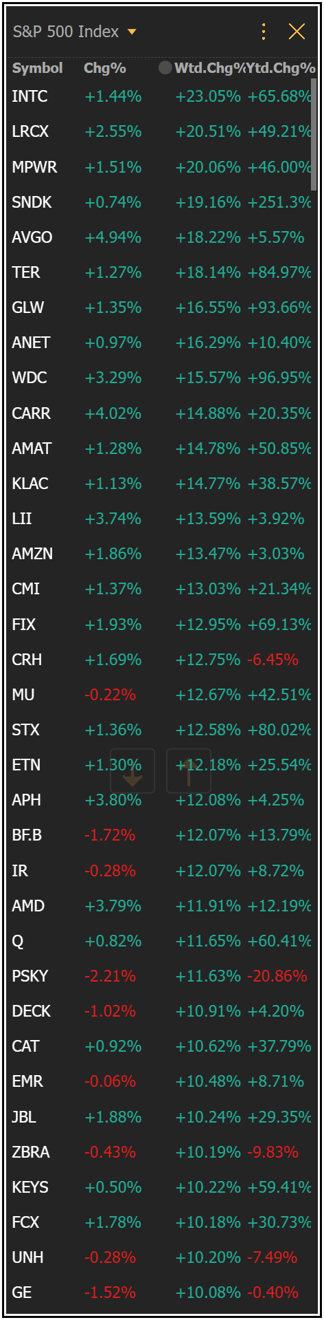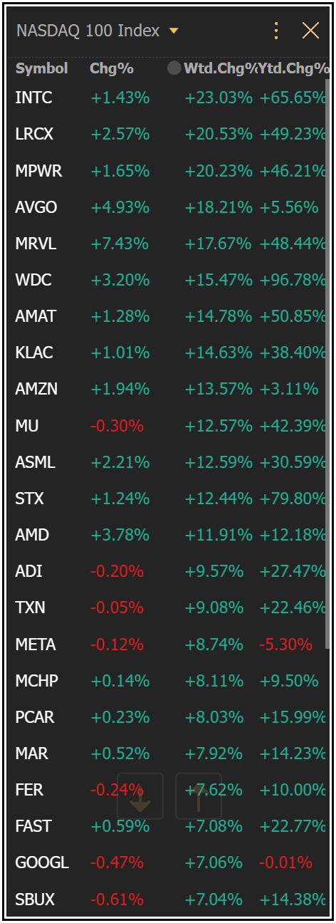 A quick review of the top performing stocks in the S&P 500 and Nasdaq 100 this week shows which stocks are being favored the most: